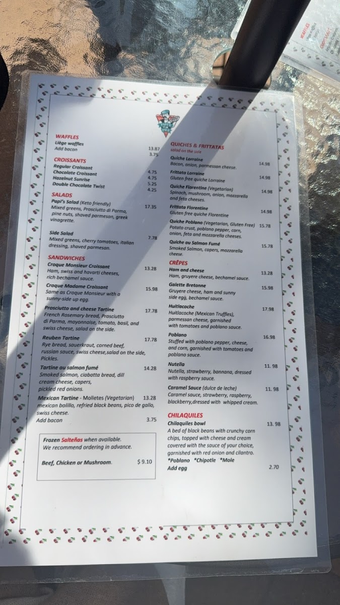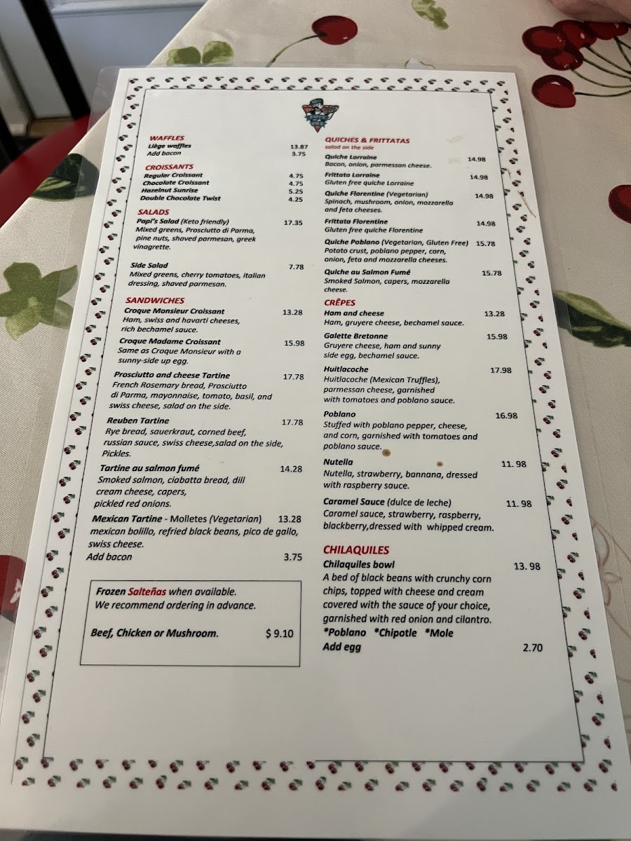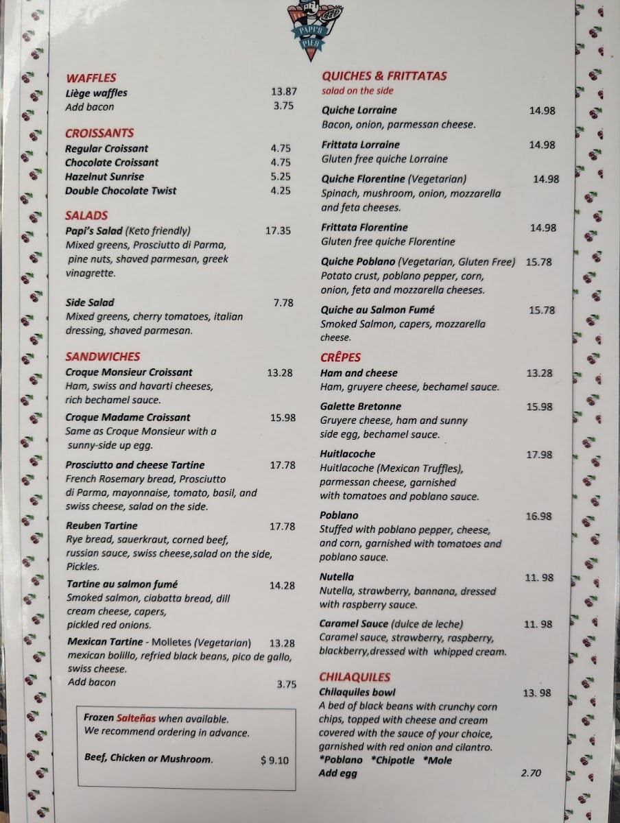 French rosemary bread, prosciutto di parma, mayonnaise, tomato, basil, swiss cheese, salad on the side.